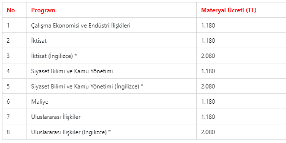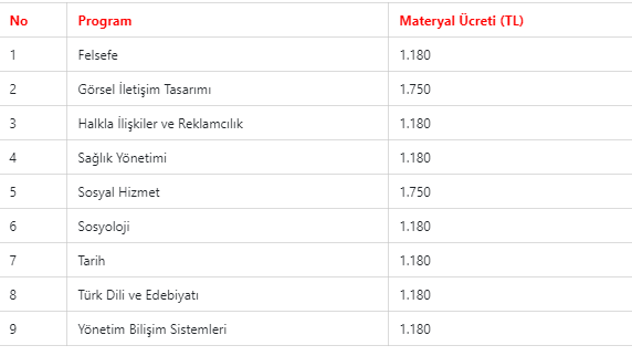 AÖF BÖLÜMLERİ VE ÜCRETLERİ TABLOSU ŞU ŞEKİLDE