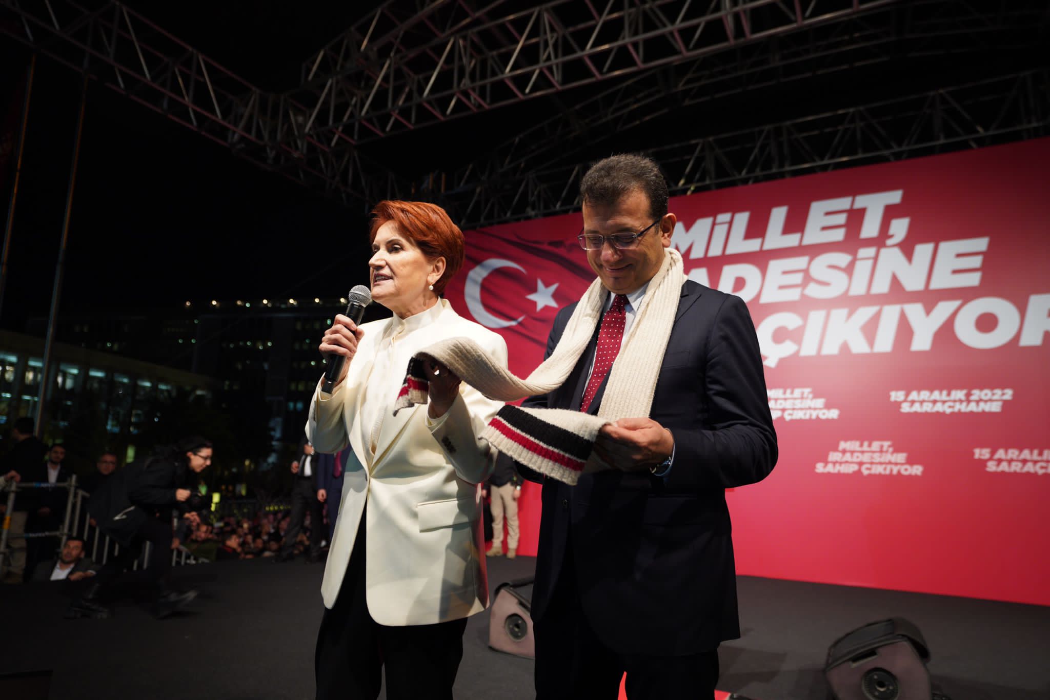 Kalabalığın "Yaşasın hürriyet, kahrolsun istibdat" şeklinde slogan atması üzerine Akşener, "Bu sese kulaklarını kapasalar da, size-bize terörist deseler de, haksız yere Ekrem kardeşimi cezalandırsalar da; bu irade, bu ses, bu yürek, bu cesaret, bu iyilik, bu demokrasi aşkı, bu sandıkta verilecek cezanın ortaya konduğu irade gösteriyor ki; artık 16 milyon İstanbullu''nun dışında 85 milyon Türkiye''nin de senin yanında olduğunu Saraçhane''den görüyoruz" şeklinde konuştu.