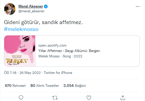 İYİ Parti lideri Meral Akşener de sosyal medya hesabından şarkıcıya destek vererek Mosso''nun seslendirdiği Bergen''in "Yıllar Affetmez" şarkısını "Gideni götürür, sandık affetmez" notuyla paylaştı.