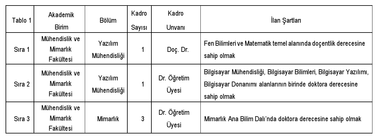 Öğretim Üyesi (profesör, doçent, doktor öğretim üyesi) olarak personel alım ilanı;