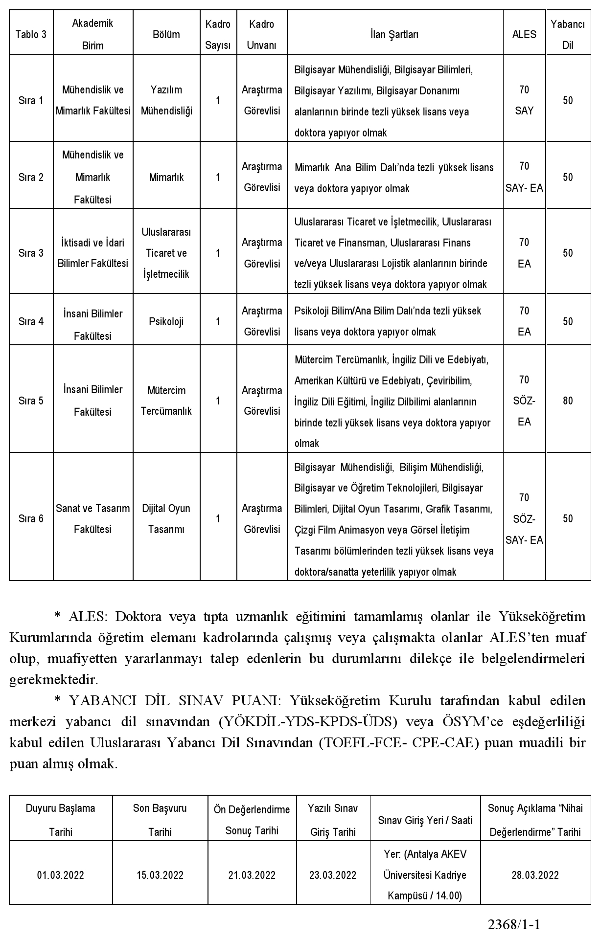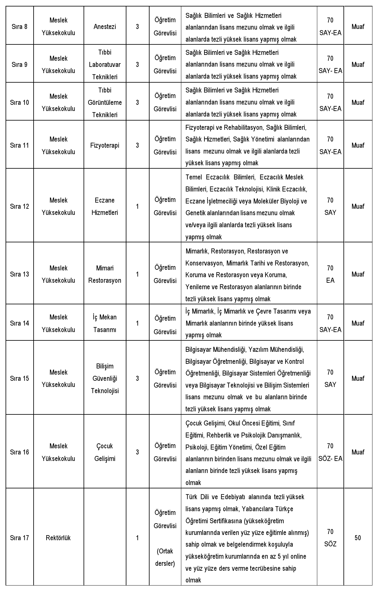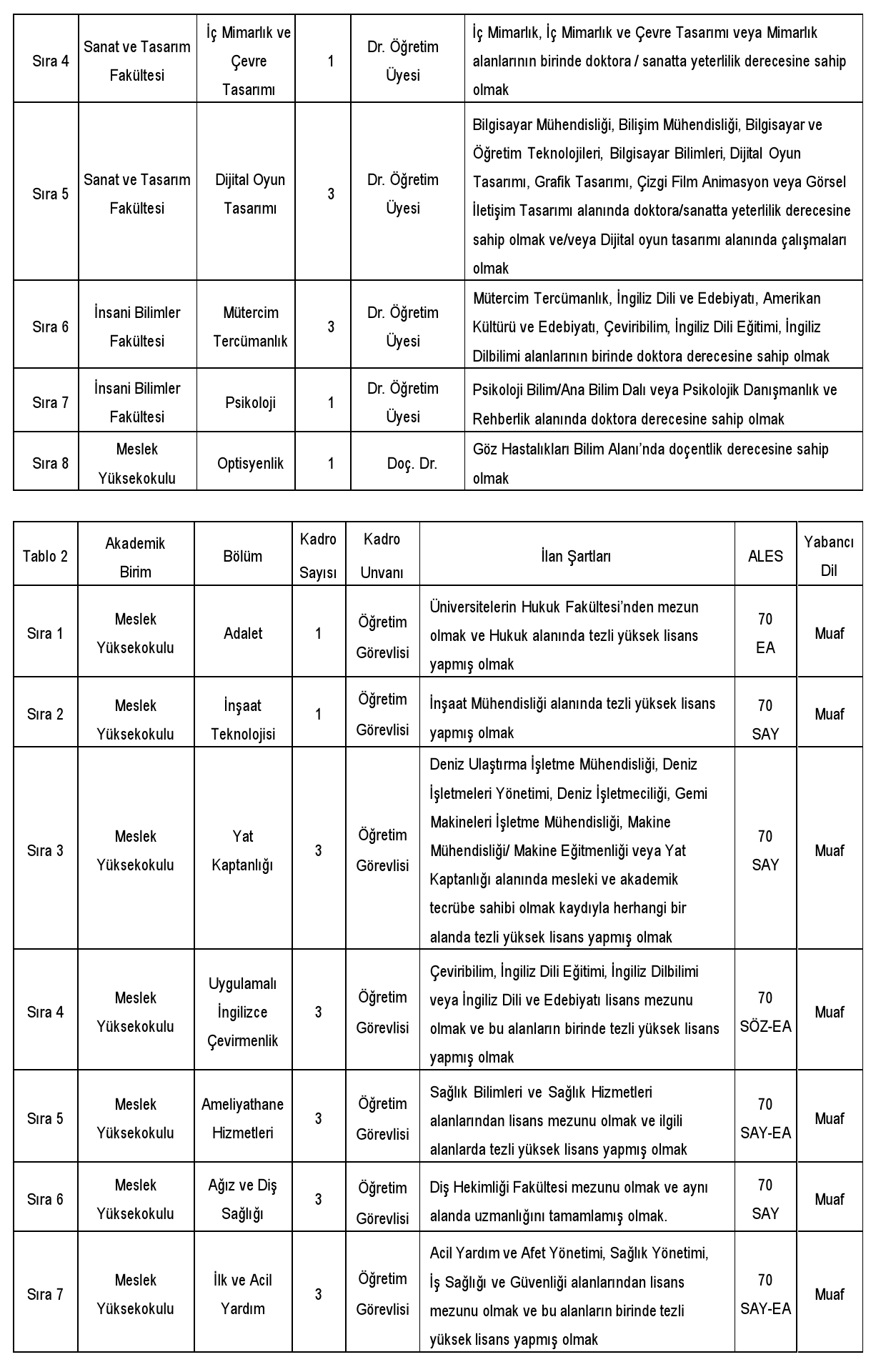 4-Üniversitemizin aşağıdaki Tablo 2 ve 3''te belirtilen birimlerine, 2547 sayılı Yükseköğretim Kanunu ve Öğretim Üyesi Dışındaki Öğretim Elemanı Kadrolarına yapılacak atamalarda Uygulanacak Merkezi Sınav ile Giriş Sınavlarına ilişkin Usul ve Esaslar Hakkında Yönetmeliğin ilgili maddelerine göre öğretim görevlileri alınacaktır. Başvuracak adayların, 09.11.2018 tarih ve 30590 sayılı Resmi Gazete''de yayımlanan "Öğretim Üyesi Dışındaki Öğretim Elemanı Kadrolarına Yapılacak Atamalarda Uygulanacak Merkezi Sınav ile Giriş Sınavlarına İlişkin Usul ve Esaslar Hakkında Yönetmelik" kapsamındaki şartları taşıması ve istenen belgeleri tamamlaması gerekmektedir. Öğretim Elemanı kadrosuna başvuracak adayların başvurularını; dilekçe ekinde nüfus cüzdanı fotokopisi, 2 adet fotoğraf, özgeçmiş, onaylı lisans, yükseklisans diplomaları ve varsa doktora öğrenci belgeleri, lisans not ortalamasını gösterir belge (transkript), ALES ve yabancı dil belgelerinin fotokopileri, Kişisel Verilerin Korunması Kanunu kapsamında aydınlatma ve açık rıza metinlerini imzalanması ile birlikte ilanın Resmi Gazete''de yayımlandığı tarihten itibaren 15 gün içerisinde şahsen veya posta ile ilgili Fakülte / Yüksekokullara yapmaları gerekmektedir.