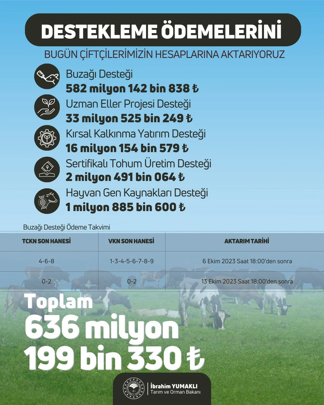 Bakan Yumaklı, bu ödemelerin hayırlı ve bereketli olmasını dilerken, 2023 yılı içerisinde toplamda 46 milyar liralık destek ödemesi yapıldığını ifade etti.