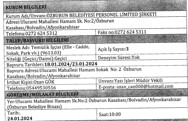Alımlara ilişkin başvuru bilgileri de belli oldu. 18-23 Ocak tarihleri arasında gerçekleşecek başvurularda, 3 kişinin temizlik görevlisi olarak işe alınacağı ifade edildi. Geçici olarak yapılacak olan bu personel alımı için başvuruların "Ulucami Mahallesi Hamam Sokak No: Özburun Kasabası / Bolvadin / Afyonkarahisar" adresine yapılması gerektiği belirtildi.
