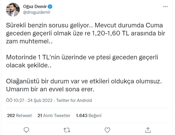 Sosyal medya hesabı Twitter''dan açıklamada bulunan Demir, "Mevcut durumda cuma geceden geçerli olmak üzere 1,20-1,60 TL arasında bir zam muhtemel. Motorinde 1 TL''nin üzerinde ve pazartesi geceden geçerli olacak şekilde" dedi.