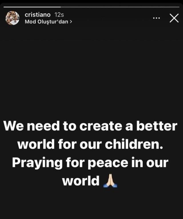 Cristiano Ronaldo yaptığı paylaşımda, "Çocuklarımız için daha iyi bir dünya yaratmalıyız. Dünyamızın barışı için dua ediyorum" ifadelerini kullanmıştı