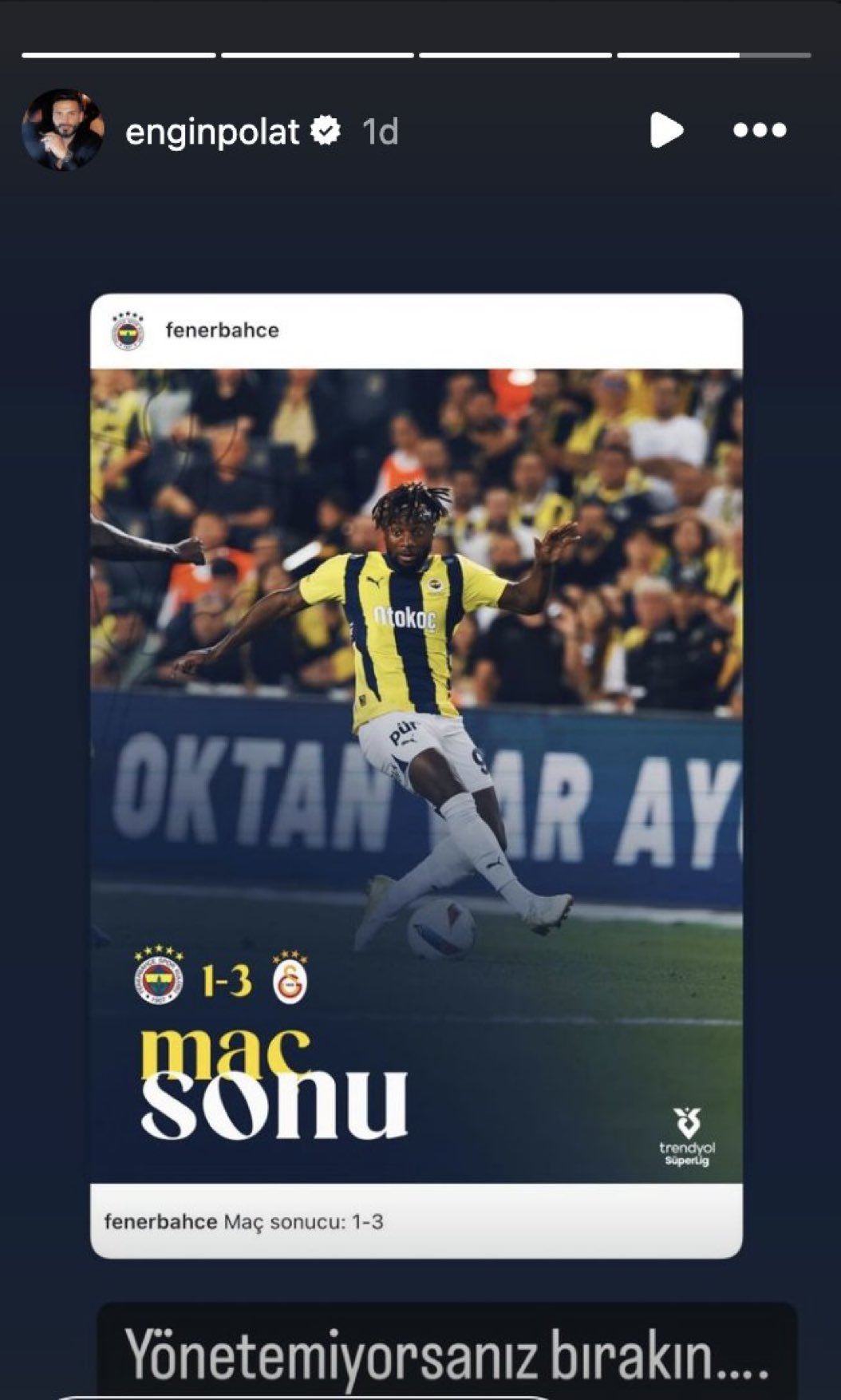 Daha önce locası olduğu bilinen Polat, Fenerbahçe’nin 3-1 mağlup olduğu derbi sonrası kulüp yönetimine sert eleştirilerde bulundu. Sosyal medya hesabından yaptığı paylaşımda, "Yönetemiyorsanız bırakın..." diyerek Fenerbahçe yönetimini hedef aldı.