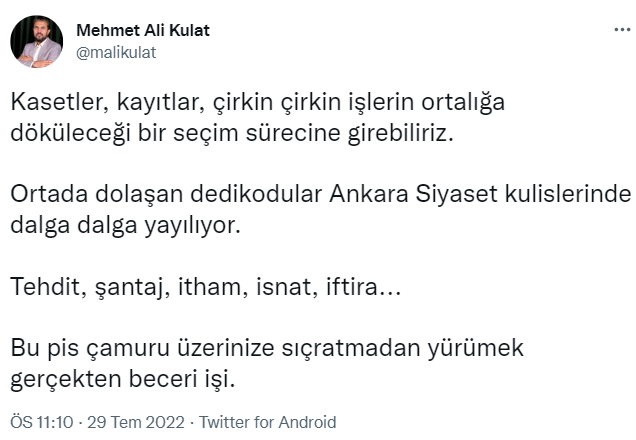 Sosyal medyadan yaptığı paylaşımda siyasi kulislerde şantaj, kaset, tehdit gibi söylentilerin arttığını vurgulayan Kulat, "Bu pis çamuru üzerinize sıçratmadan yürümek gerçekten beceri işi" dedi.