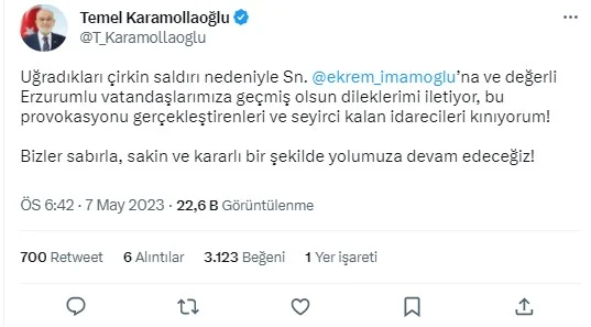 "Uğradıkları çirkin saldırı nedeniyle Sn. @ekrem_imamoglu’na ve değerli Erzurumlu vatandaşlarımıza geçmiş olsun dileklerimi iletiyor, bu provokasyonu gerçekleştirenleri ve seyirci kalan idarecileri kınıyorum! Bizler sabırla, sakin ve kararlı bir şekilde yolumuza devam edeceğiz!"