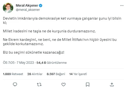 "Devletin imkânlarıyla demokrasiye ket vurmaya çalışanlar şunu iyi bilsin ki; Millet iradesini ne taşla ne de kurşunla durduramazsınız. Ne Ekrem kardeşimi, ne beni, ne de Millet İttifakı''nın hiçbir üyesini bu şekilde korkutamazsınız. Biz bu seçimi sükûnetle kazanacağız!"