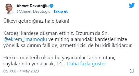 "Ülkeyi getirdiğiniz hale bakın! Kardeşi kardeşe düşman ettiniz. Erzurum’da Sn. Ekrem İmamoğlu ve miting alanındaki kardeşlerimize yönelik saldırının faili de, azmettiricisi de bu kirli iktidardır. Herkes müsterih olsun bu yaşananlar tarihin utanç sayfalarında yer alacak, 14 Mayıs’ta ülkemiz huzura kavuşacak."