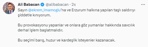 "Sayın @ekrem_imamoglu’na ve Erzurum halkına yapılan taşlı saldırıyı şiddetle kınıyorum. Bu provokasyonu yapanlar ve onlara göz yumanlar hakkında savcılık derhal işlem başlatmalıdır. Bu seçimi barış, huzur ve kardeşlik isteyenler kazanacak."