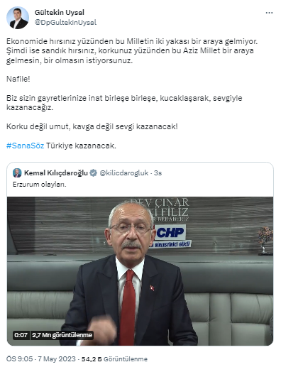 Şimdi ise sandık hırsınız, korkunuz yüzünden bu Aziz Millet bir araya gelmesin, bir olmasın istiyorsunuz. Nafile! Biz sizin gayretlerinize inat birleşe birleşe, kucaklaşarak, sevgiyle kazanacağız. Korku değil umut, kavga değil sevgi kazanacak! #SanaSöz Türkiye kazanacak."