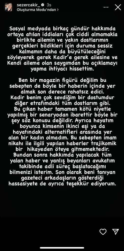Konuyla ilgili Sezer Çakır sosyal medya hesabından yaptığı açıklamada Kadir Doğulu''nun çok sevdiği bir dostu olduğunu belirtti. İşte, o açıklama;