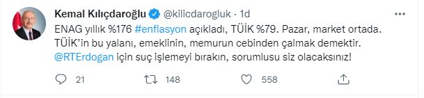 "ENAG yıllık %176 #enflasyon açıkladı, TÜİK %79. Pazar, market ortada. TÜİK’in bu yalanı, emeklinin, memurun cebinden çalmak demektir. @RTErdogan için suç işlemeyi bırakın, sorumlusu siz olacaksınız!"