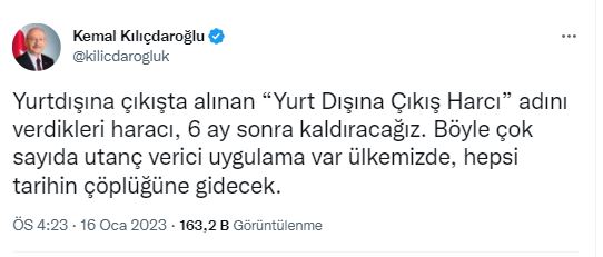 Kemal Kılıçdaroğlu, sosyal medya hesabı üzerinden yurt dışı çıkış harcını ‘haraç’ olarak adlandırarak “6 ay sonra kaldıracağız. Böyle çok sayıda utanç verici uygulama var ülkemizde. Hepsi tarihin çöplüğüne gidecek” sözleriyle tepki gösterdi.