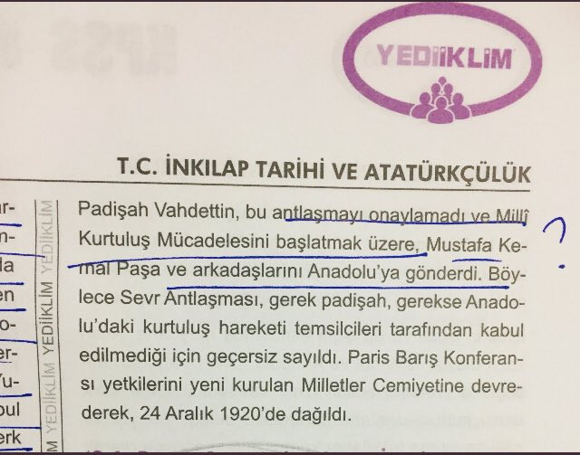 Yediiklim Yayınları’nın daha önceki yıllara ait bir KPSS deneme kitabında Milli Mücadele’yi başlatanın Mustafa Kemal Atatürk değil, son padişah Vahdettin olduğu belirtildi.