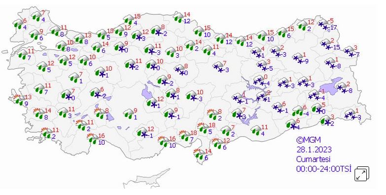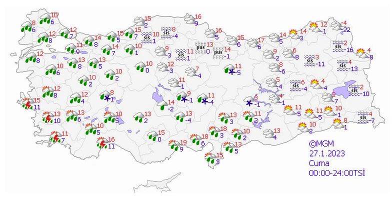 Parçalı, yer yer çok bulutlu, aralıklı yağmurlu, yüksekleri karla karışık yağmur ve kar yağışlı