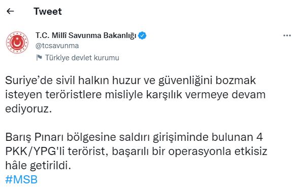 Milli Savunma Bakanlığı''nın Twitter hesabından yapılan açıklamada; " Suriye’de sivil halkın huzur ve güvenliğini bozmak isteyen teröristlere misliyle karşılık vermeye devam ediyoruz. Barış Pınarı bölgesine saldırı girişiminde bulunan 4 PKK/YPG''li terörist, başarılı bir operasyonla etkisiz hâle getirildi" ifadelerine yer verildi.