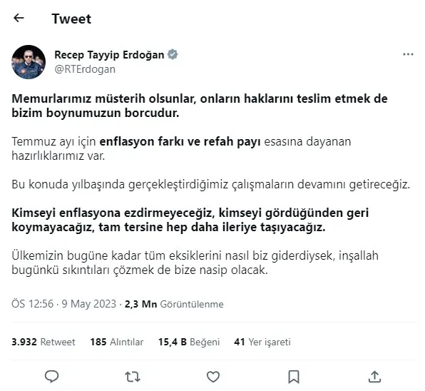 Kişisel sosyal medya hesabından bir paylaşım yaparak temmuzdaki memur zammını işaret eden AKP Genel Başkanı ve Cumhurbaşkanı Erdoğan, "Memurlarımız müsterih olsunlar, onların haklarını teslim etmek de bizim boynumuzun borcudur. Temmuz ayı için enflasyon farkı ve refah payı esasına dayanan hazırlıklarımız var." ifadelerini kullandı. Erdoğan, "Bu konuda yılbaşında gerçekleştirdiğimiz çalışmaların devamını getireceğiz. Kimseyi enflasyona ezdirmeyeceğiz, tam tersine hep daha ileriye taşıyacağız. Ülkemizin bugüne kadar tüm eksiklerini nasıl biz giderdiysek, inşallah bugünkü sıkıntıları çözmek de bize nasip olacak." dedi.
