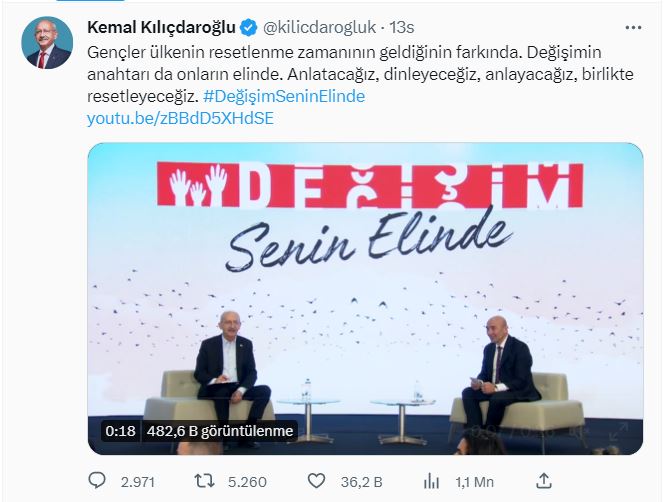 Kılıçdaroğlu, programa ilişkin paylaşımında “Gençler ülkenin resetlenme zamanının geldiğinin farkında. Değişimin anahtarı da onların elinde. Anlatacağız, dinleyeceğiz, anlayacağız, birlikte resetleyeceğiz. Değişim senin elinde” ifadelerine yer verdi.