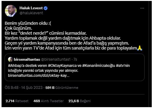 İddia üzerine twitter hesabından paylaşım yapan Haluk Levent "Benim yüzümden oldu :( Çok üzgünüm. Bir kez ''devlet nerde?'' cümlesi kurmadılar. Yardım toplamak değil yardım dağıtmak için Ahbapta oldular. Geçen yıl yardım kampanyasında ben de Afad’a bağış yapmıştım. İzin verin yarın TV’de Afad için tüm sanatçılarla biz de para toplayalım" şeklinde konuştu.