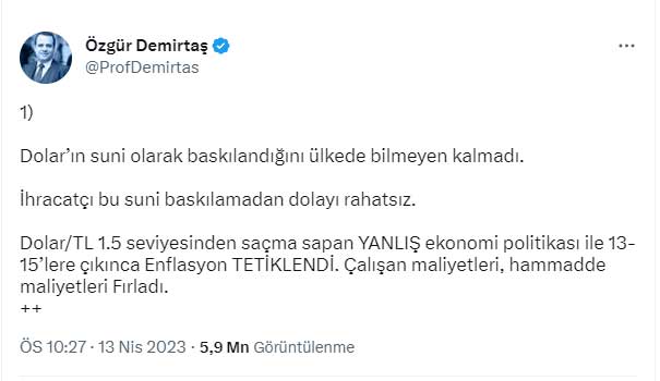 Şu anda iki farklı döviz kuru olduğunu belirten Demirtaş, seçim ekonomisi nedeniyle baskılanan dövizin, yakın zamanda gerçek değerine geleceğini beliritrken, sosyal medya hesabından yaptığı paylaşımlarda "Dolar’ın suni olarak baskılandığını ülkede bilmeyen kalmadı. İhracatçı bu suni baskılamadan dolayı rahatsız. Dolar/TL 1.5 seviyesinden saçma sapan YANLIŞ ekonomi politikası ile 13-15’lere çıkınca enflasyon tetiklendi. Çalışan maliyetleri, hammadde maliyetleri fırladı.