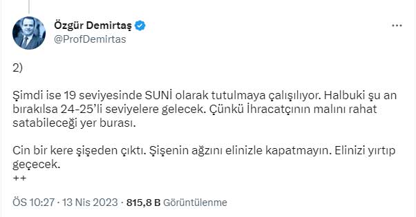 Şimdi ise 19 seviyesinde SUNİ olarak tutulmaya çalışılıyor. Halbuki şu an bırakılsa 24-25’li seviyelere gelecek. Çünkü İhracatçının malını rahat satabileceği yer burası. Cin bir kere şişeden çıktı. Şişenin ağzını elinizle kapatmayın. Elinizi yırtıp geçecek