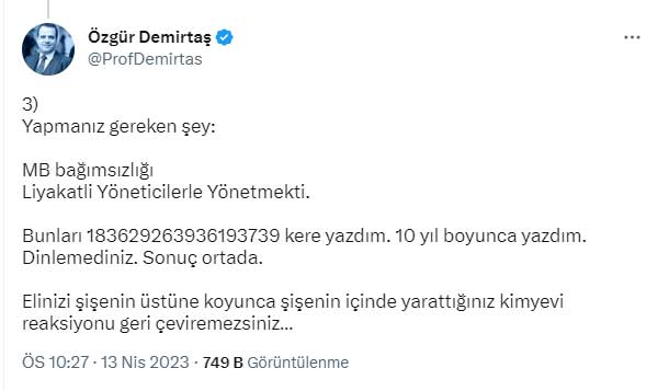 Yapmanız gereken şey: MB bağımsızlığı Liyakatli Yöneticilerle Yönetmekti. Bunları 183629263936193739 kere yazdım. 10 yıl boyunca yazdım. Dinlemediniz. Sonuç ortada. Elinizi şişenin üstüne koyunca şişenin içinde yarattığınız kimyevi reaksiyonu geri çeviremezsiniz…" ifadelerini kullandı.