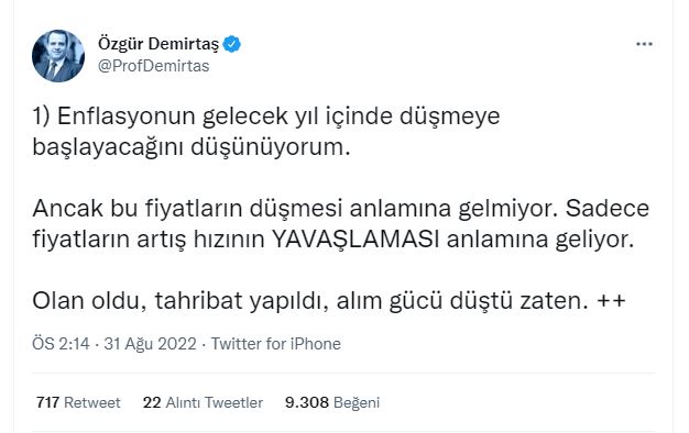 1) Enflasyonun gelecek yıl içinde düşmeye başlayacağını düşünüyorum.
