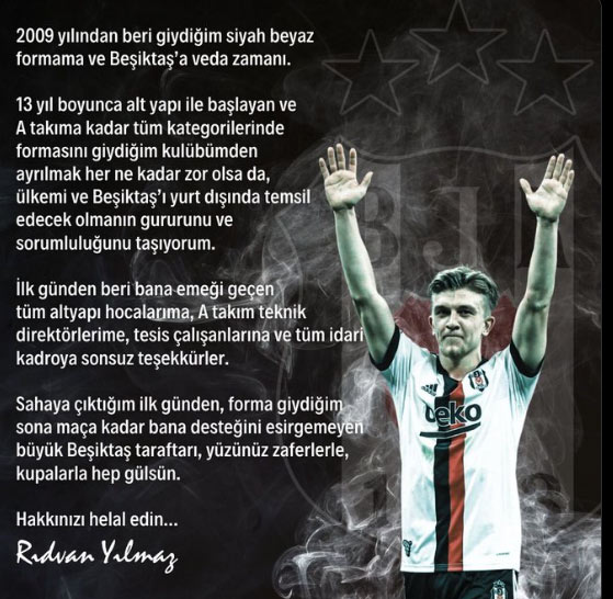 "2009 yılından beri giydiğim siyah beyaz formama ve Beşiktaş''a veda zamanı. 13 yıl boyunca altyapı ile başlayan ve A takıma kadar tüm kategorilerinde formasını giydiğim kulübümden ayrılmak her ne kadar zor olsa da ülkemi ve Beşiktaş''ı yurt dışında temsil edecek olmanın gururunu ve sorumluğunu taşıyorum. İlk günden beri bana emeği geçen tüm altyapı hocalarıma, A takım teknik direktörlerime, tesis çalışanlarına ve tüm idari kadroya sonsuz teşekkürler. Sahaya çıktığım ilk günden, forma giydiğim son maça kadar bana desteğini esirgemeyen büyük Beşiktaş taraftarları, yüzünüz zaferlerle, kupalarla hep gülsün."