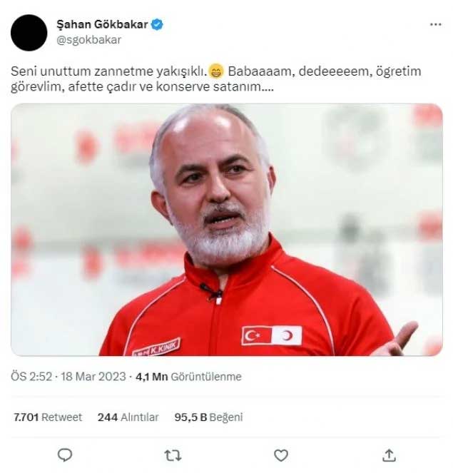 Gökbakar, sosyal medya hesabından yaptığı paylaşımda Kınık''a seslenerek "Seni unuttum zannetme yakışıklı. Babaaaam, dedeeeeem, ögretim görevlim, afette çadır ve konserve satanım" ifadelerini kullandı.