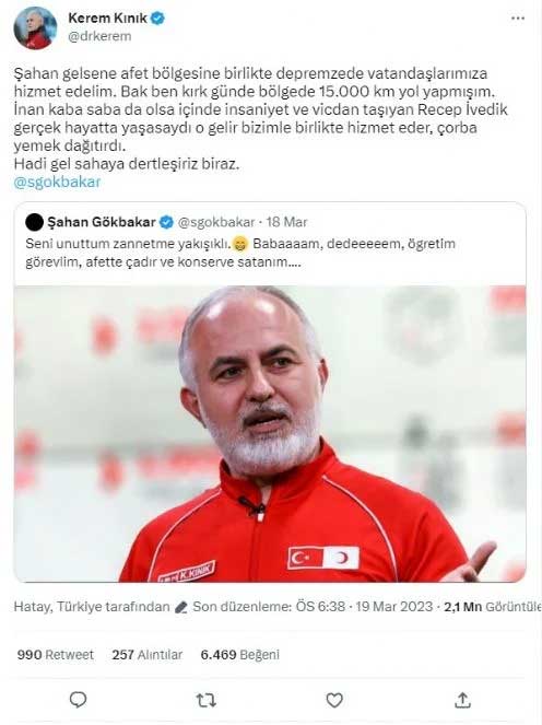 Gökbakar''ın paylaşımına yanıt veren Kınık, kendisi hakkında atılan tweeti alıntılayarak alıntılayarak“Şahan gelsene afet bölgesine birlikte depremzede vatandaşlarımıza hizmet edelim. Bak ben kırk günde bölgede 15.000 km yol yapmışım. İnan kaba saba da olsa içinde insaniyet ve vicdan taşıyan Recep İvedik gerçek hayatta yaşasaydı o gelir bizimle birlikte hizmet eder, çorba yemek dağıtırdı. Hadi gel sahaya dertleşiriz biraz” şeklinde konuştu.