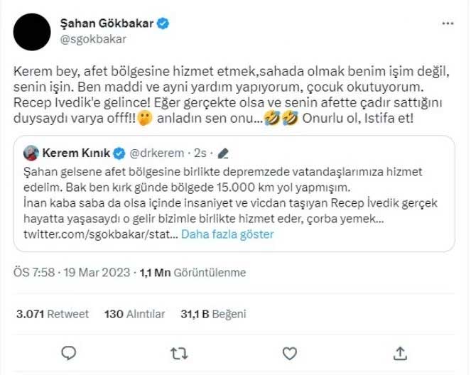 Kınık''ın verdiği yanıta Gökbakar cephesinden yanıt gecikmezken, Gökbakar, kendisini deprem bölgesine davet eden Kınık için "Kerem bey, afet bölgesine hizmet etmek, sahada olmak benim işim değil, senin işin. Ben maddi ve ayni yardım yapıyorum, çocuk okutuyorum.” dedi.