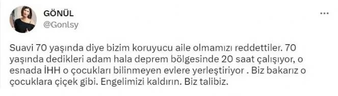 Saygan sosyal medya hesabından “Suavi 70 yaşında diye bizim koruyucu aile olmamızı reddettiler. 70 yaşında dedikleri adam, hâlâ deprem bölgesinde 20 saat çalışıyor. Biz o çocuklara, çiçek gibi bakarız. Engelimizi kaldırın. Biz talibiz” ifadelerini kullandı.