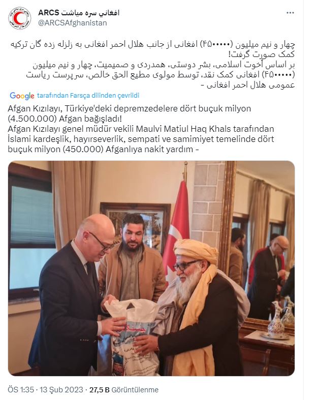 ARCS''nin Twitter hesabından yapılan paylaşımda, ARCS Başkanı Matiul Hak Halis’in Türkiye’nin Afganistan Büyükelçisi Cihad Erginay’a bir naylon poşet içinde deprem yardımını verdiği görüldü.