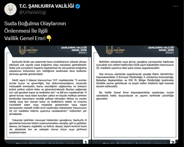 Valilik, boğulma vakalarının önüne geçilmesi amacıyla sulama kanalları, barajlar, akarsular, göller ve göletlere girilmesini yasakladı. Valilikten yapılan yazılı açıklamada, Şanlıurfa Valisi Hasan Şıldak'ın boğulma vakalarına karşı hassasiyet gösterdiği ve bu konuda yeni kararlar aldığı belirtildi.