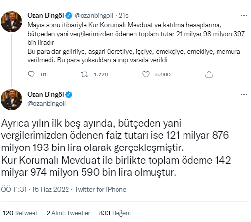 Ayrıca yılın ilk beş ayında, bütçeden yani vergilerimizden ödenen faiz tutarı ise 121 milyar 876 milyon 193 bin lira olarak gerçekleşmiştir. Kur Korumalı Mevduat ile birlikte toplam ödeme 142 milyar 974 milyon 590 bin lira olmuştur.