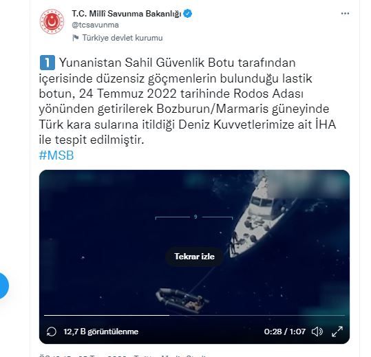 "Yunanistan Sahil Güvenlik Botu tarafından içerisinde düzensiz göçmenlerin bulunduğu lastik botun, 24 Temmuz 2022 tarihinde Rodos Adası yönünden getirilerek Bozburun/Marmaris güneyinde Türk kara sularına itildiği Deniz Kuvvetlerimize ait İHA ile tespit edilmiştir."